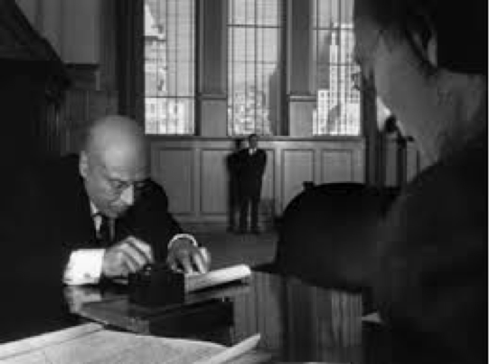 I noticed two instances of Welles’ leveraging visual film techniques to manipulate the physical proximity between actors to convey Kane’s identity. The first time I noticed this was in the scene in which Gettys is blackmailing Kane. Welles uses a low-angled shot to demonstrate the heightened importance of Kane. This technique is so overt that it almost appears as if Kane is looming over them.